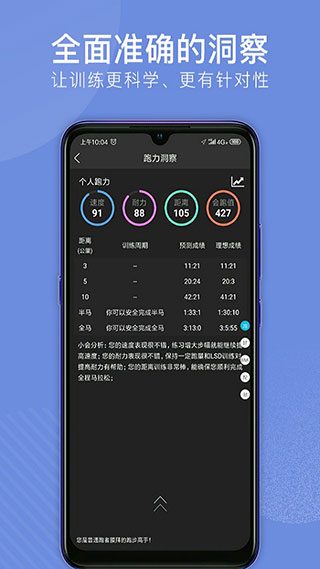 2、全面智能的运动洞察,数百个参数不断学习,准确建立个人运动能力模型,能准确推荐配速区间和预测比赛成绩