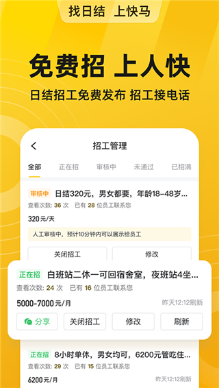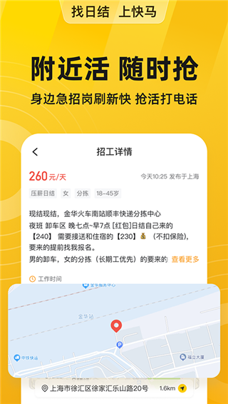 快马日结app是一款非常可靠的网上招聘平台,现在的社会竞争压力是越来越大,很多朋友在三四十岁后失业,很难再找到什么合适的工作,所以不少朋友选择了做日结,虽然比较辛苦,但是工资还可以,但是就是找活难。好在平台覆盖的工作机会比较广泛,涵盖了各行各业,像普工、小时工、临时工、兼职、全职一网打尽,大家可以根据自己的需求进行选择。比如你想找离家近一点的,工资高一点的,休息多一点的,都可以按照此类要求进行筛选,平台会为你推荐合适的工作,点击查看详情后觉得还不错的话直接和HR或者老板聊,可以的话可以投递简历,等待面试机会。