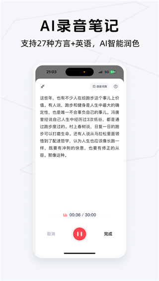 AI 实时转录&纠正:只需要开始说话,系统将自动把语音转换成文字,转换纠正过程实时可见,说错也没事,继续往下说就好了,交给 AI;