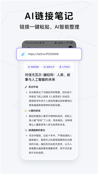 看到一篇公众号文章,可以直接复制链接粘贴进来,AI 将提炼文章要点,变成你的笔记存下来;